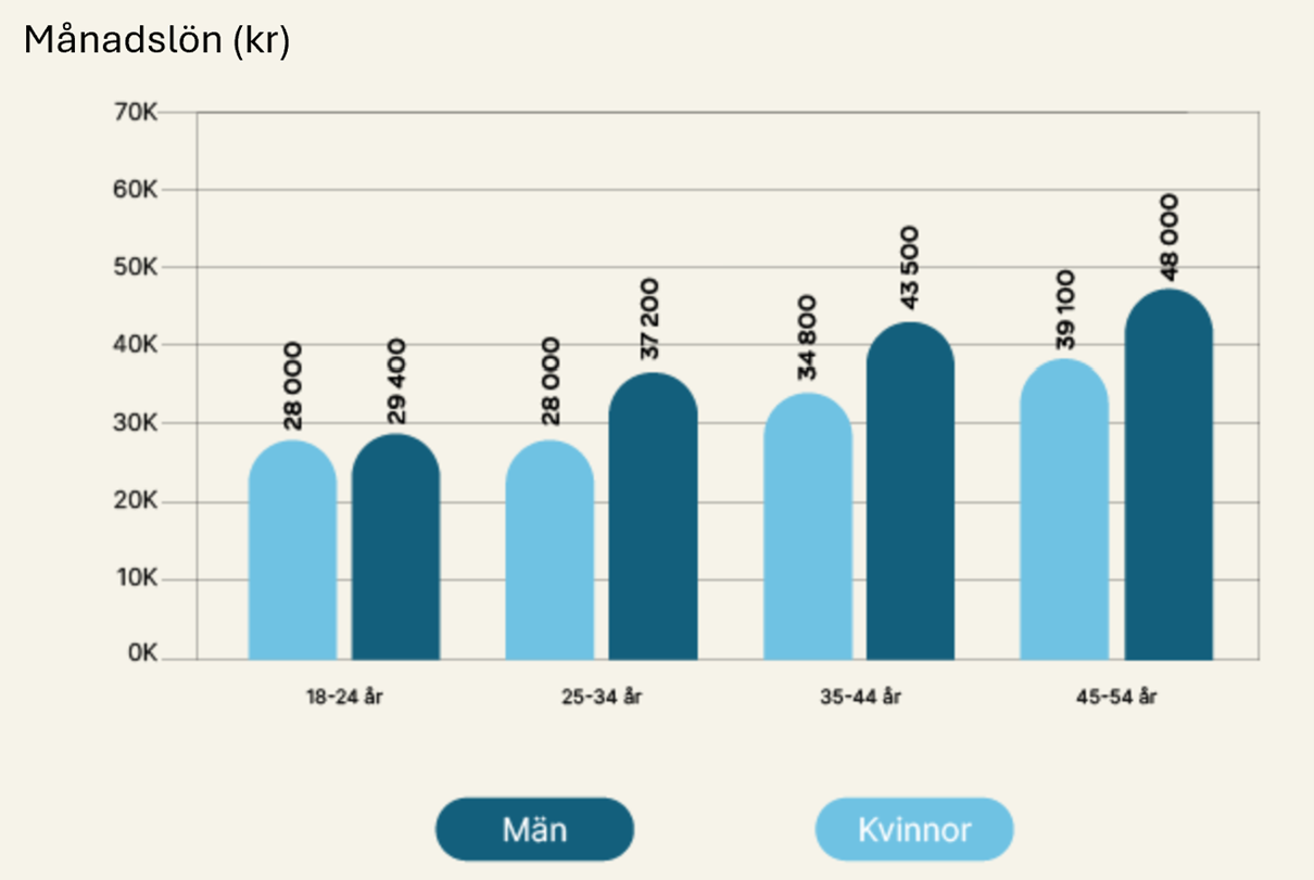 När man presenterat diagrammet, steg för steg, är det dags att låta eleverna reflektera över diagrammet i sin helhet. Är det något som förvånar dem? Är det något de undrar över? Diagrammet om månadslöner här nedanför väcker kanske frågor om skillnader mellan kvinnors och mäns löner. Vad beror de på? Hur mycket mer tjänar en genomsnittlig man jämfört med en genomsnittlig kvinna på ett år? På tio år? På ett helt arbetsliv?
